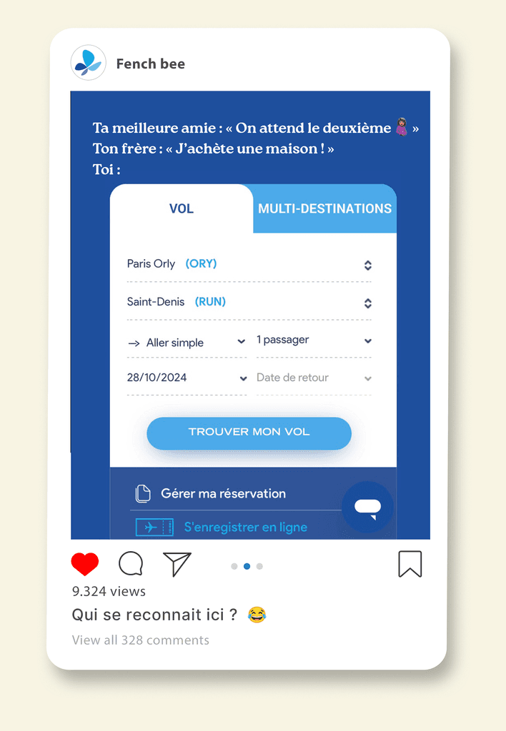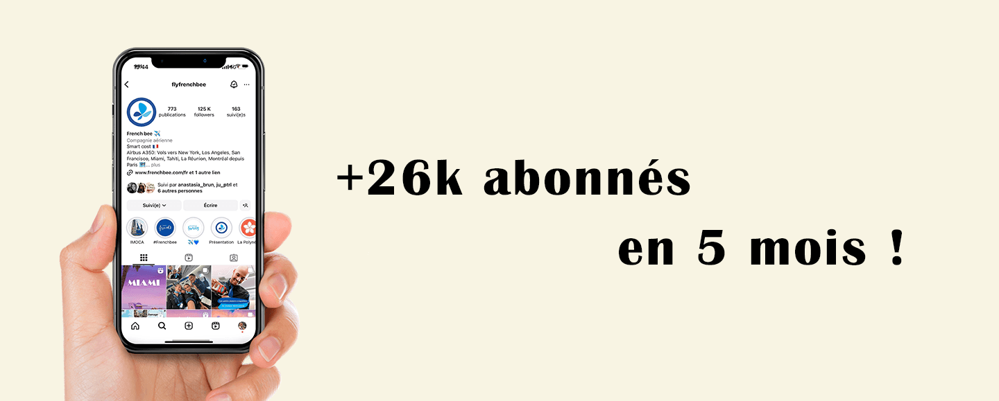 ✈️ French Bee est une compagnie aérienne française spécialisée dans les vols long-courriers à prix compétitifs. Elle relie la France à des destinations de rêve comme la Réunion, Tahiti ou encore New York. J’ai accompagné l'agence Rosbeef! sur le compte Instagram, Facebook et Tiktok de French bee pendant près de 6 mois.